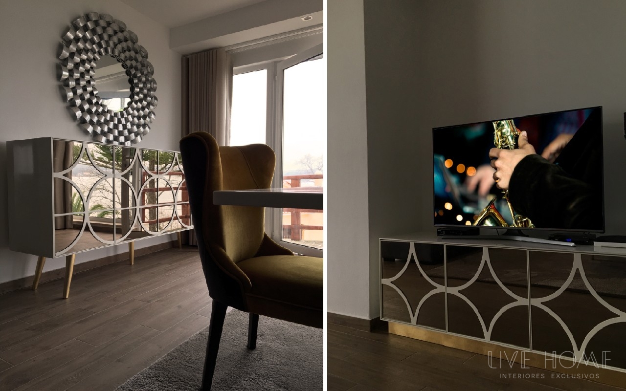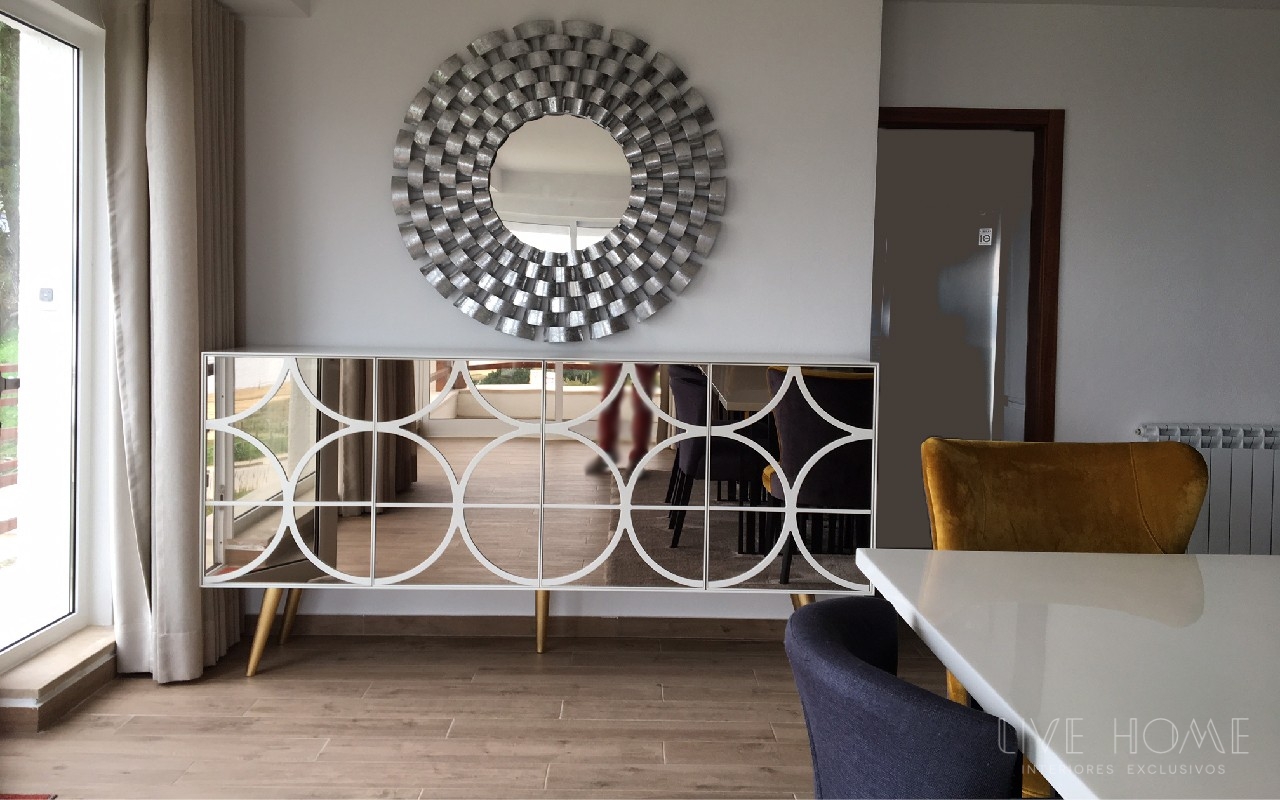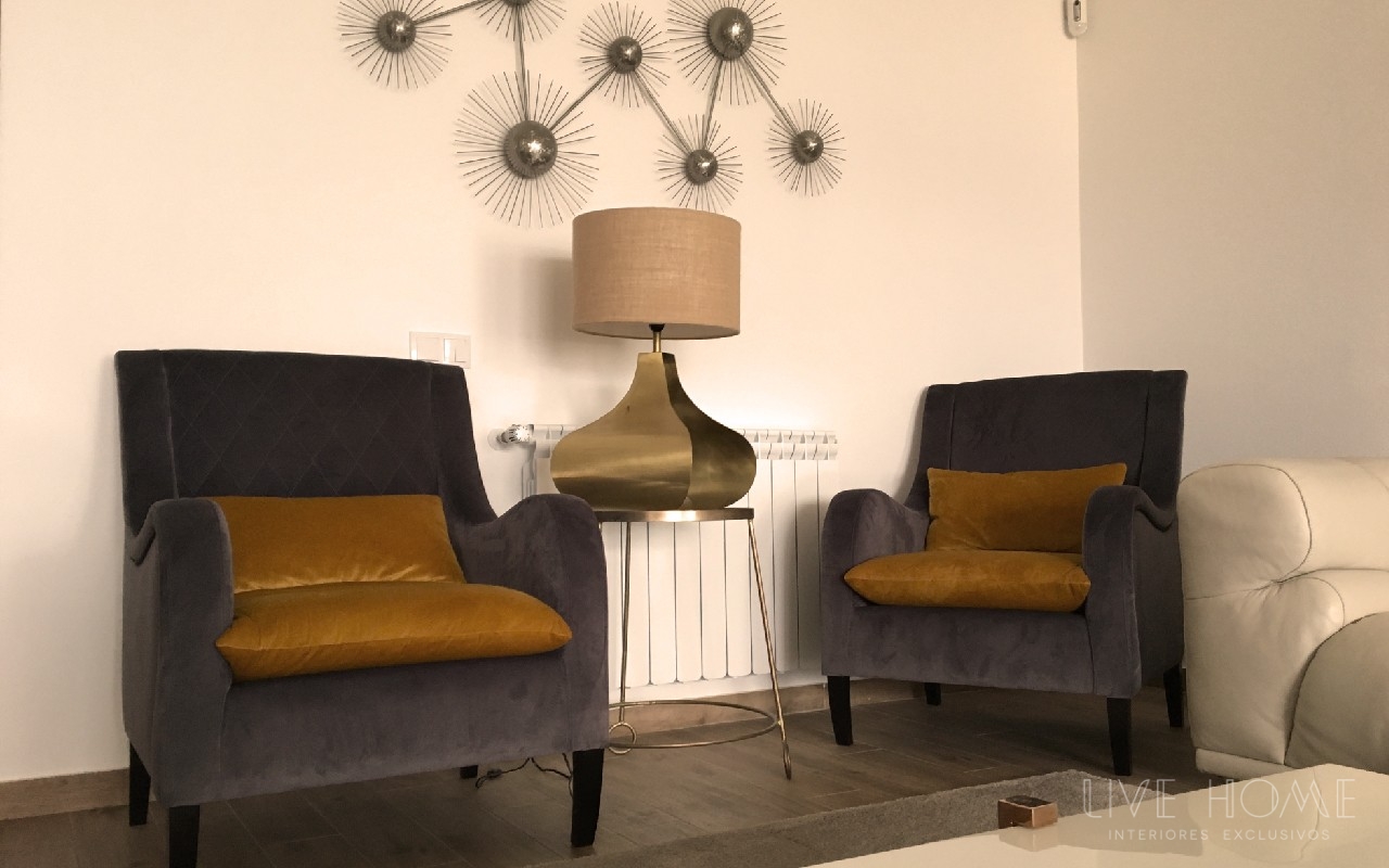 Decoração para zonas Living, sala de estar e de refeições, em moradia na Fóz do Arelho. Selecção de mobiliário, sofás, cadeirões, iluminação, tapetes, cortinados, papéis de parede, tecidos, peças de decoração e complementos.