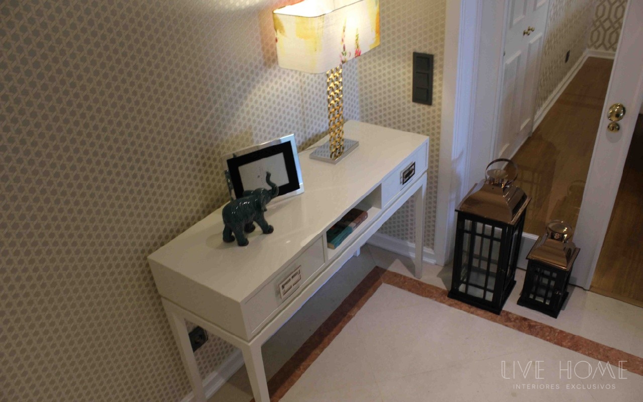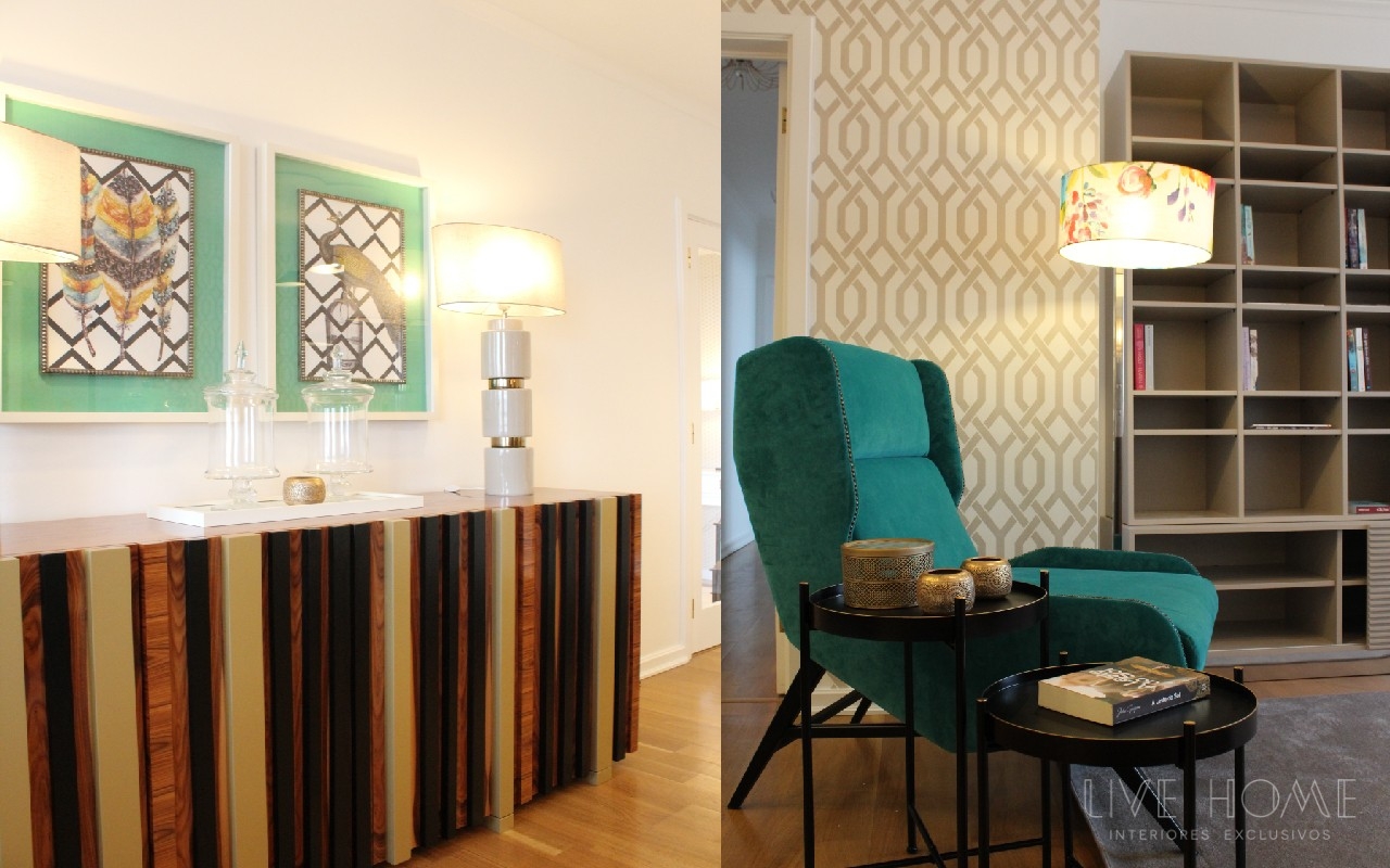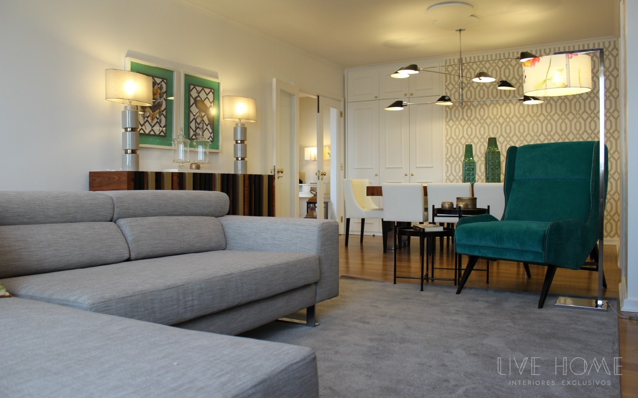 Decoração integral de apartamento na Lapa, em Lisboa. Serviço de acompanhamento e seleção de materiais; decoração, Design e montagem de mobiliário, sofás, cadeirões, iluminação, tapetes, cortinados, papéis de parede, tecidos, peças de decoração e complementos.